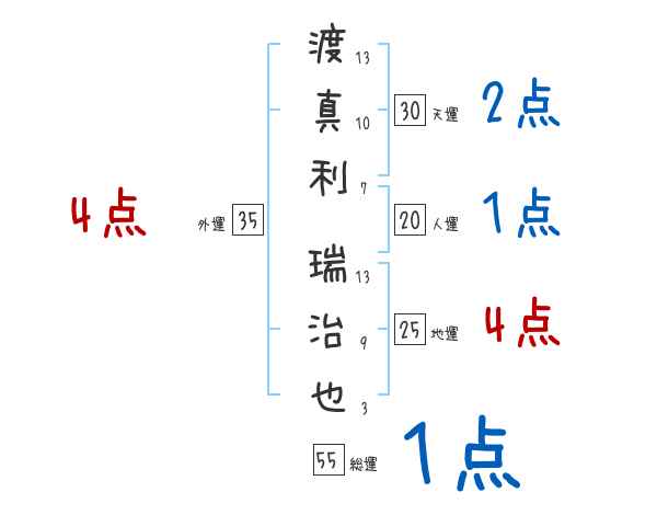 天運![]() | 渡真利瑞治也さんの天運は30画の2つ星!浮き沈みの激しさに注意しましょう。 家系が持つ宿命的な運勢を表します。祖先から受け継いだ苗字ですので自分の力が及びません。家柄を象徴します。 |