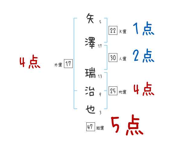 | 外運  | 矢澤瑞治也さんの外運は17画の4つ星!積極的な行動力。地位を気づき財産を手に入れる。純粋な心と直感力。生活面を象徴する運勢です。外部から受ける影響力を表し、結婚運、家庭運や職場、環境への順応性を表します。 |