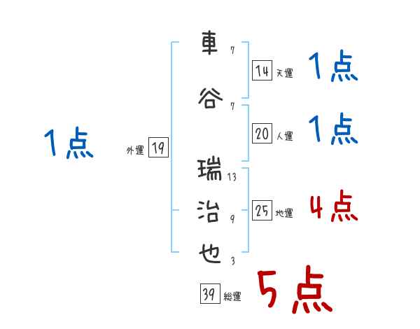 外運![]() | 車谷瑞治也さんの外運は19画の1つ星!優れた才能を持ちますが、協調性が足りないことも。周りの人と協力する事を意識しましょう。 生活面を象徴する運勢です。外部から受ける影響力を表し、結婚運、家庭運や職場、環境への順応性を表します。 |