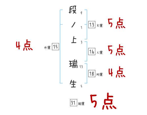 天運![]() | 段ノ上瑞生さんの天運は13画の5つ星!才能に恵まれ人気がある。名声を手に入れる。円満な人生。 家系が持つ宿命的な運勢を表します。祖先から受け継いだ苗字ですので自分の力が及びません。家柄を象徴します。 |
