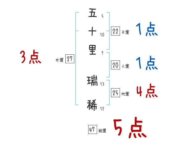 総運![]() | 五十里瑞稀さんの総運は47画の5つ星!実力が開花し発展する円満な人生。財に恵まれる。 あなたの人生を表す1番重要な運勢です。生涯を通じて影響する総合運となり、主に50歳以降の晩年期に影響を及ぼします。 |
