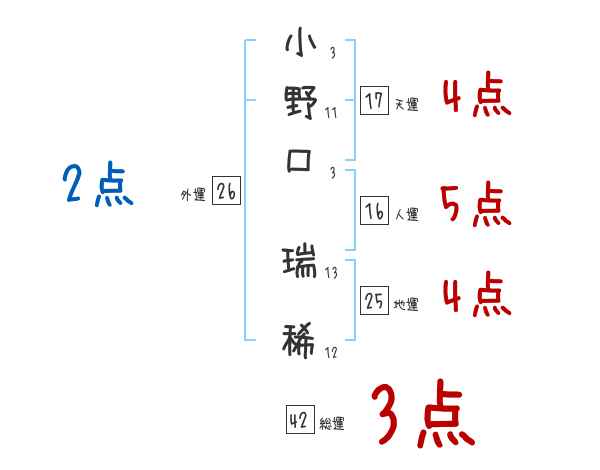 人運![]() | 小野口瑞稀さんの人運は16画の5つ星!人望が厚く大きく発展する。逆転成功が見える。 性格や才能などを表す2番目に重要な運勢です。人間関係や協調性、社会的な成功に影響します。主に20歳から50歳ぐらいまでの中年期の運勢を表します。 |
