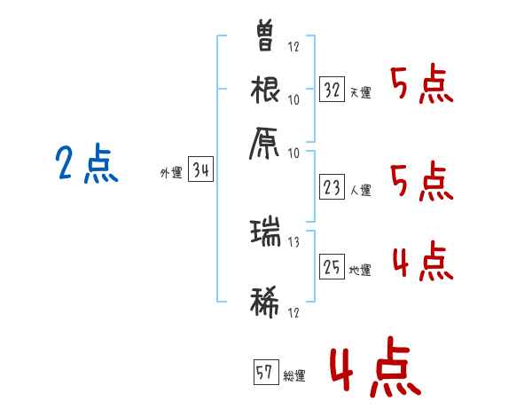 天運![]() | 曽根原瑞稀さんの天運は32画の5つ星!柔軟性があり成功する。チャンスが多く金運が良い。 家系が持つ宿命的な運勢を表します。祖先から受け継いだ苗字ですので自分の力が及びません。家柄を象徴します。 |