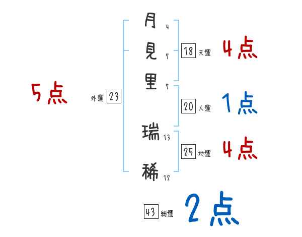 天運![]() | 月見里瑞稀さんの天運は18画の4つ星!情熱的で剛気。忍耐力があり信頼される。 家系が持つ宿命的な運勢を表します。祖先から受け継いだ苗字ですので自分の力が及びません。家柄を象徴します。 |
