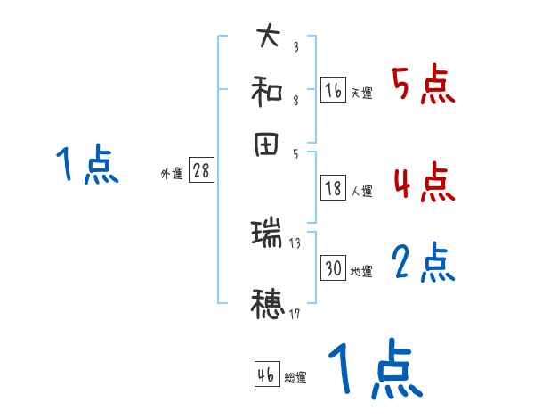 天運![]() | 大和田瑞穂さんの天運は16画の5つ星!人望が厚く大きく発展する。逆転成功が見える。 家系が持つ宿命的な運勢を表します。祖先から受け継いだ苗字ですので自分の力が及びません。家柄を象徴します。 |