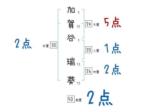 外運![]() | 加賀谷瑞葵さんの外運は30画の2つ星!浮き沈みの激しさに注意しましょう。 生活面を象徴する運勢です。外部から受ける影響力を表し、結婚運、家庭運や職場、環境への順応性を表します。 |