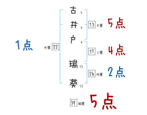 外運![]() | 古井戸瑞葵さんの外運は22画の1つ星!努力することが苦手ないっぽう手先が器用。芸術性にも優れる。 生活面を象徴する運勢です。外部から受ける影響力を表し、結婚運、家庭運や職場、環境への順応性を表します。 |