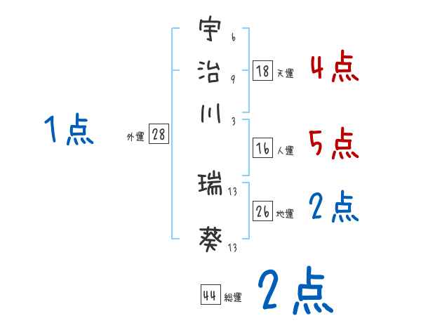 総運![]() | 宇治川瑞葵さんの総運は44画の2つ星!誠実で慎重な性格。物事を考えすぎないように注意しましょう。 あなたの人生を表す1番重要な運勢です。生涯を通じて影響する総合運となり、主に50歳以降の晩年期に影響を及ぼします。 |