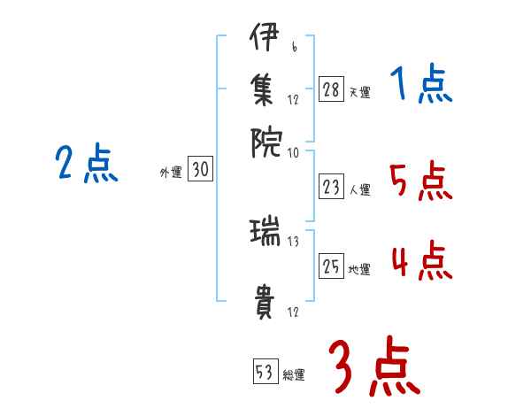 天運![]() | 伊集院瑞貴さんの天運は28画の1つ星!家庭環境に注意。スポーツで活躍できる能力があるかも。 家系が持つ宿命的な運勢を表します。祖先から受け継いだ苗字ですので自分の力が及びません。家柄を象徴します。 |