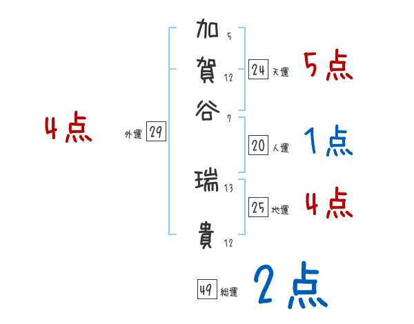 天運![]() | 加賀谷瑞貴さんの天運は24画の5つ星!家庭運が良く順調な人生。金運にも恵まれる。 家系が持つ宿命的な運勢を表します。祖先から受け継いだ苗字ですので自分の力が及びません。家柄を象徴します。 |