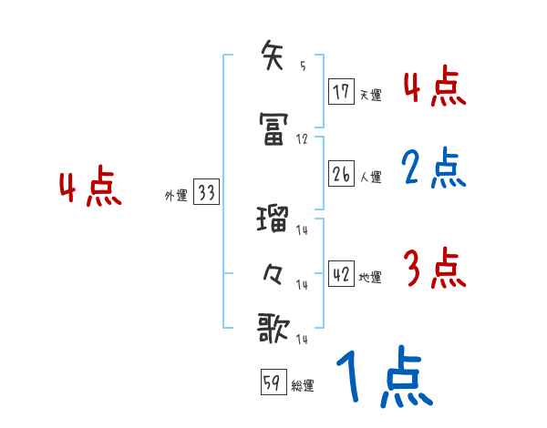 地運![]() | 矢冨瑠々歌さんの地運は42画の3つ星!病気に注意。多芸であるが消極的でおとなしい。 個性を表す基礎的な運勢です。性格形成や対人関係、行動力など家庭環境に影響されます。主に誕生してから20歳くらいまでの若年期の運勢を表します。 |