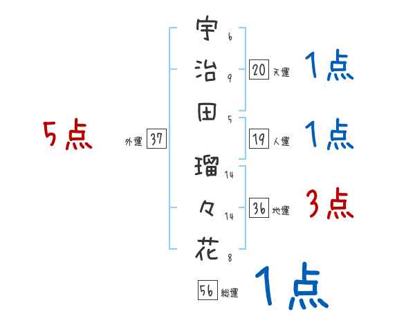 総運![]() | 宇治田瑠々花さんの総運は56画の1つ星!消極的で無気力になりがち。誠実な気持ちが必要でしょう。 あなたの人生を表す1番重要な運勢です。生涯を通じて影響する総合運となり、主に50歳以降の晩年期に影響を及ぼします。 |