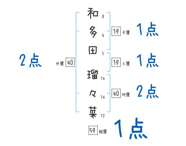 天運![]() | 和多田瑠々菜さんの天運は19画の1つ星!優れた才能を持ちますが、協調性が足りないことも。周りの人と協力する事を意識しましょう。 家系が持つ宿命的な運勢を表します。祖先から受け継いだ苗字ですので自分の力が及びません。家柄を象徴します。 |