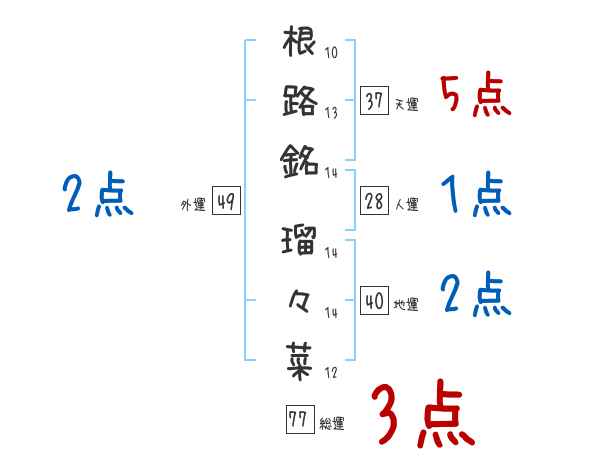 総運![]() | 根路銘瑠々菜さんの総運は77画の3つ星!多少不安定であるが晩年は吉。不屈の精神。 あなたの人生を表す1番重要な運勢です。生涯を通じて影響する総合運となり、主に50歳以降の晩年期に影響を及ぼします。 |