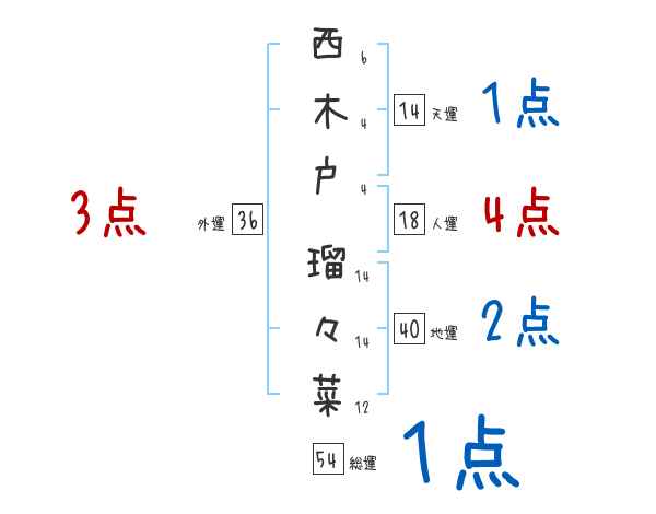 外運![]() | 西木戸瑠々菜さんの外運は36画の3つ星!先見性が豊かです。多少神経質で苦労することも。 生活面を象徴する運勢です。外部から受ける影響力を表し、結婚運、家庭運や職場、環境への順応性を表します。 |
