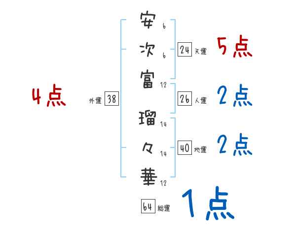 天運![]() | 安次富瑠々華さんの天運は24画の5つ星!家庭運が良く順調な人生。金運にも恵まれる。 家系が持つ宿命的な運勢を表します。祖先から受け継いだ苗字ですので自分の力が及びません。家柄を象徴します。 |