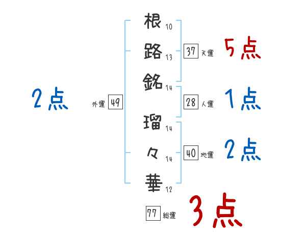 人運![]() | 根路銘瑠々華さんの人運は28画の1つ星!家庭環境に注意。スポーツで活躍できる能力があるかも。 性格や才能などを表す2番目に重要な運勢です。人間関係や協調性、社会的な成功に影響します。主に20歳から50歳ぐらいまでの中年期の運勢を表します。 |