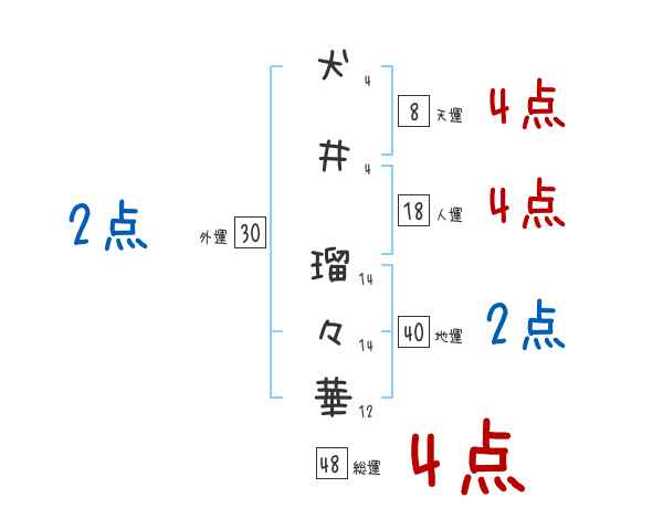天運![]() | 犬井瑠々華さんの天運は8画の4つ星!勤勉家。根気強く努力し成功する。忍耐力がある。 家系が持つ宿命的な運勢を表します。祖先から受け継いだ苗字ですので自分の力が及びません。家柄を象徴します。 |