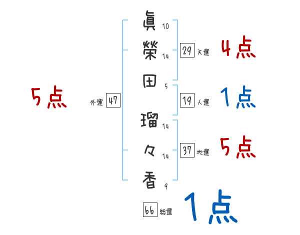 外運![]() | 眞榮田瑠々香さんの外運は47画の5つ星!実力が開花し発展する円満な人生。財に恵まれる。 生活面を象徴する運勢です。外部から受ける影響力を表し、結婚運、家庭運や職場、環境への順応性を表します。 |