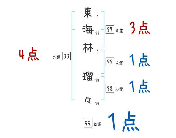 外運![]() | 東海林瑠々さんの外運は33画の4つ星!権力志向でプライドが高い。勇気があり運を切り開き成功する。 生活面を象徴する運勢です。外部から受ける影響力を表し、結婚運、家庭運や職場、環境への順応性を表します。 |