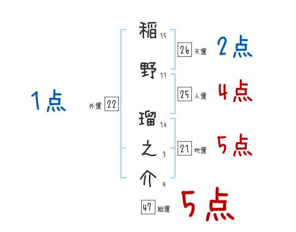 外運![]() | 稲野瑠之介さんの外運は22画の1つ星!努力することが苦手ないっぽう手先が器用。芸術性にも優れる。 生活面を象徴する運勢です。外部から受ける影響力を表し、結婚運、家庭運や職場、環境への順応性を表します。 |