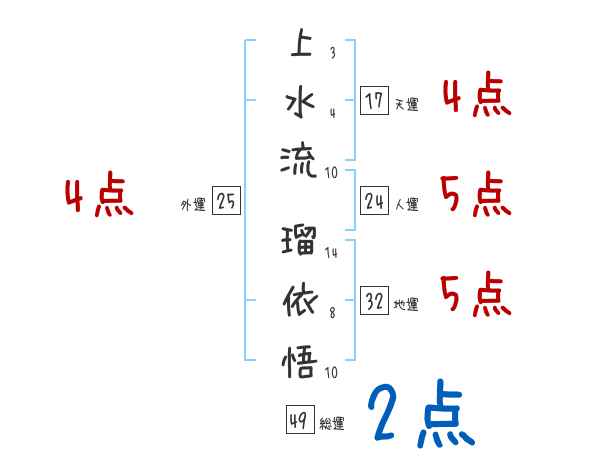 地運![]() | 上水流瑠依悟さんの地運は32画の5つ星!柔軟性があり成功する。チャンスが多く金運が良い。 個性を表す基礎的な運勢です。性格形成や対人関係、行動力など家庭環境に影響されます。主に誕生してから20歳くらいまでの若年期の運勢を表します。 |