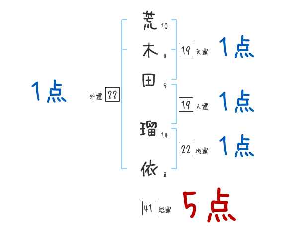 総運![]() | 荒木田瑠依さんの総運は41画の5つ星!大志を抱き、目標に向かって実力を発揮し達成する。温和な性格。 あなたの人生を表す1番重要な運勢です。生涯を通じて影響する総合運となり、主に50歳以降の晩年期に影響を及ぼします。 |