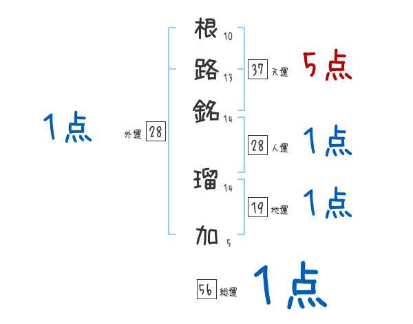 人運![]() | 根路銘瑠加さんの人運は28画の1つ星!家庭環境に注意。スポーツで活躍できる能力があるかも。 性格や才能などを表す2番目に重要な運勢です。人間関係や協調性、社会的な成功に影響します。主に20歳から50歳ぐらいまでの中年期の運勢を表します。 |