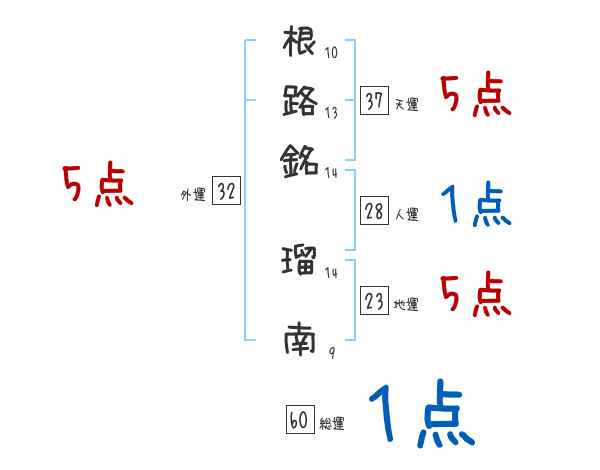 外運![]() | 根路銘瑠南さんの外運は32画の5つ星!柔軟性があり成功する。チャンスが多く金運が良い。 生活面を象徴する運勢です。外部から受ける影響力を表し、結婚運、家庭運や職場、環境への順応性を表します。 |