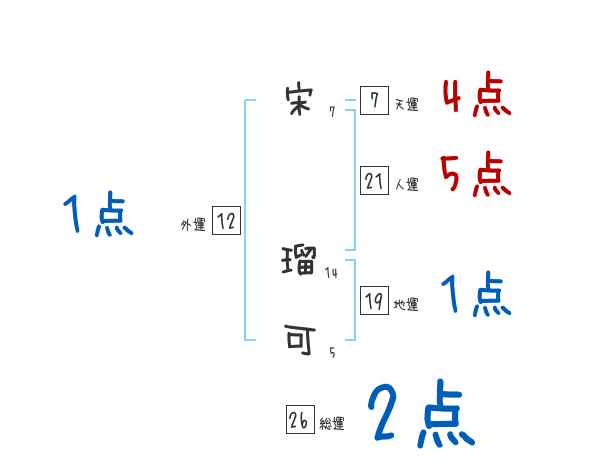 総運![]() | 宋瑠可さんの総運は26画の2つ星!波瀾万丈かも。信頼できる人を大事にしましょう。 あなたの人生を表す1番重要な運勢です。生涯を通じて影響する総合運となり、主に50歳以降の晩年期に影響を及ぼします。 |