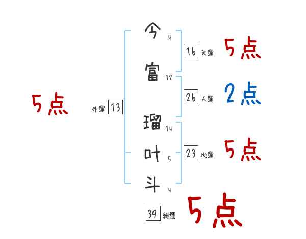 外運![]() | 今富瑠叶斗さんの外運は13画の5つ星!才能に恵まれ人気がある。名声を手に入れる。円満な人生。 生活面を象徴する運勢です。外部から受ける影響力を表し、結婚運、家庭運や職場、環境への順応性を表します。 |