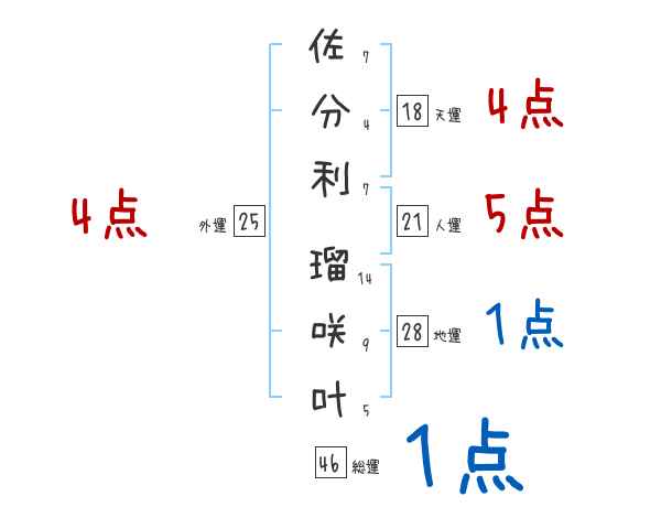 天運![]() | 佐分利瑠咲叶さんの天運は18画の4つ星!情熱的で剛気。忍耐力があり信頼される。 家系が持つ宿命的な運勢を表します。祖先から受け継いだ苗字ですので自分の力が及びません。家柄を象徴します。 |