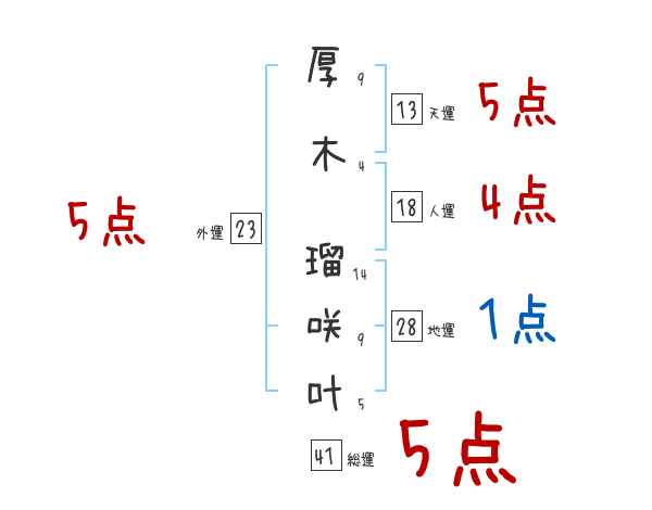 外運![]() | 厚木瑠咲叶さんの外運は23画の5つ星!想像力に優れ活力がある。一代で成功し名誉を手に入れる。 生活面を象徴する運勢です。外部から受ける影響力を表し、結婚運、家庭運や職場、環境への順応性を表します。 |