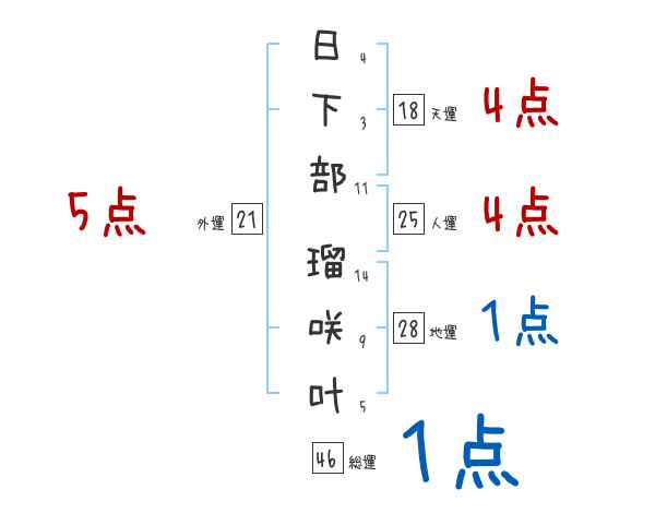 天運![]() | 日下部瑠咲叶さんの天運は18画の4つ星!情熱的で剛気。忍耐力があり信頼される。 家系が持つ宿命的な運勢を表します。祖先から受け継いだ苗字ですので自分の力が及びません。家柄を象徴します。 |