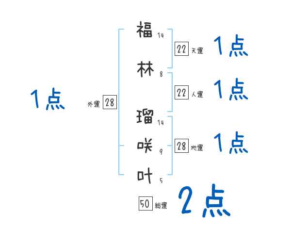 総運![]() | 福林瑠咲叶さんの総運は50画の2つ星!浮き沈みが激しく不安定。しりすぼみに衰退しやすいので注意しましょう。 あなたの人生を表す1番重要な運勢です。生涯を通じて影響する総合運となり、主に50歳以降の晩年期に影響を及ぼします。 |