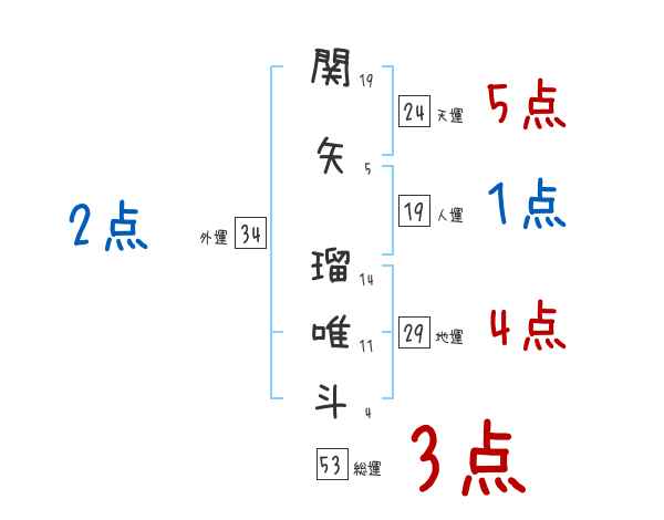 天運![]() | 関矢瑠唯斗さんの天運は24画の5つ星!家庭運が良く順調な人生。金運にも恵まれる。 家系が持つ宿命的な運勢を表します。祖先から受け継いだ苗字ですので自分の力が及びません。家柄を象徴します。 |