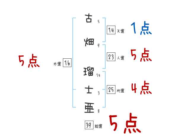 外運![]() | 古畑瑠士亜さんの外運は16画の5つ星!人望が厚く大きく発展する。逆転成功が見える。 生活面を象徴する運勢です。外部から受ける影響力を表し、結婚運、家庭運や職場、環境への順応性を表します。 |