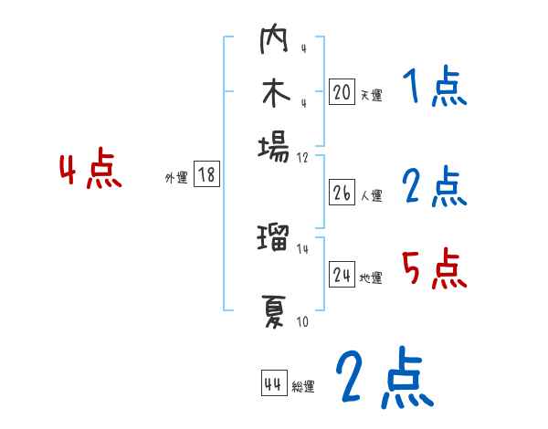 総運![]() | 内木場瑠夏さんの総運は44画の2つ星!誠実で慎重な性格。物事を考えすぎないように注意しましょう。 あなたの人生を表す1番重要な運勢です。生涯を通じて影響する総合運となり、主に50歳以降の晩年期に影響を及ぼします。 |