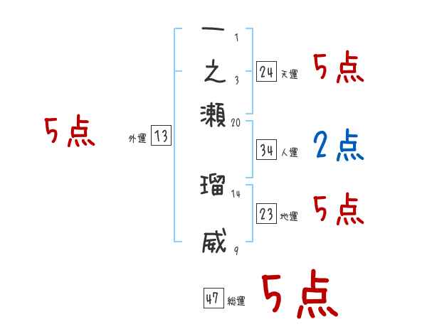 総運![]() | 一之瀬瑠威さんの総運は47画の5つ星!実力が開花し発展する円満な人生。財に恵まれる。 あなたの人生を表す1番重要な運勢です。生涯を通じて影響する総合運となり、主に50歳以降の晩年期に影響を及ぼします。 |