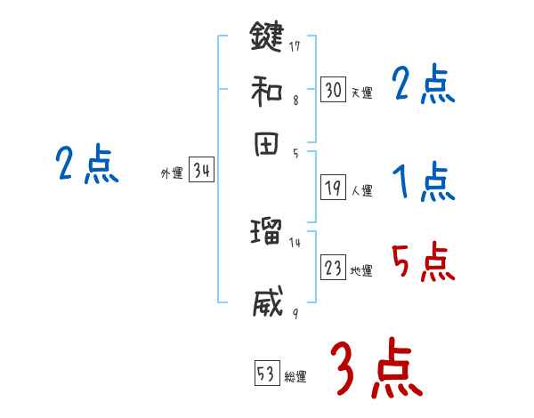 天運![]() | 鍵和田瑠威さんの天運は30画の2つ星!浮き沈みの激しさに注意しましょう。 家系が持つ宿命的な運勢を表します。祖先から受け継いだ苗字ですので自分の力が及びません。家柄を象徴します。 |