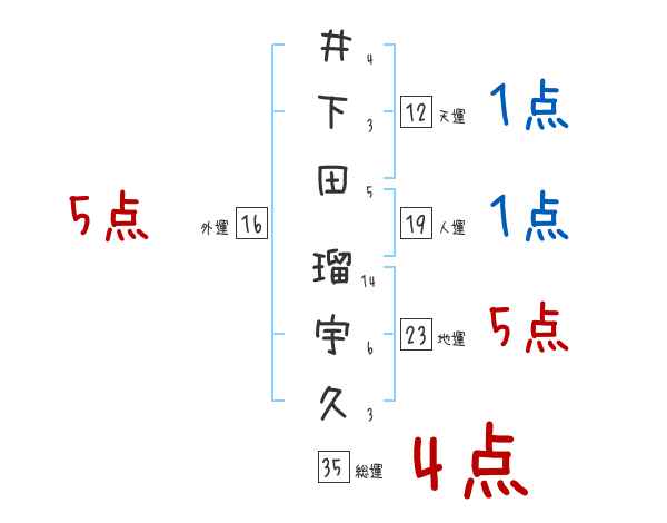 外運![]() | 井下田瑠宇久さんの外運は16画の5つ星!人望が厚く大きく発展する。逆転成功が見える。 生活面を象徴する運勢です。外部から受ける影響力を表し、結婚運、家庭運や職場、環境への順応性を表します。 |