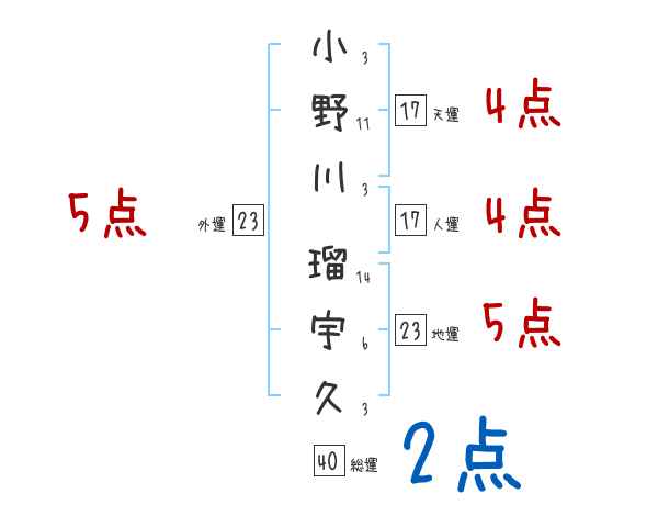 外運![]() | 小野川瑠宇久さんの外運は23画の5つ星!想像力に優れ活力がある。一代で成功し名誉を手に入れる。 生活面を象徴する運勢です。外部から受ける影響力を表し、結婚運、家庭運や職場、環境への順応性を表します。 |