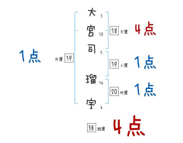 外運![]() | 大宮司瑠宇さんの外運は19画の1つ星!優れた才能を持ちますが、協調性が足りないことも。周りの人と協力する事を意識しましょう。 生活面を象徴する運勢です。外部から受ける影響力を表し、結婚運、家庭運や職場、環境への順応性を表します。 |