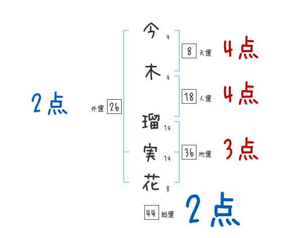 外運![]() | 今木瑠実花さんの外運は26画の2つ星!波瀾万丈かも。信頼できる人を大事にしましょう。 生活面を象徴する運勢です。外部から受ける影響力を表し、結婚運、家庭運や職場、環境への順応性を表します。 |