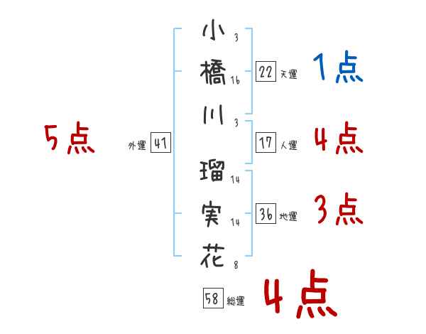 総運![]() | 小橋川瑠実花さんの総運は58画の4つ星!安定した生活。大器晩成タイプ。 あなたの人生を表す1番重要な運勢です。生涯を通じて影響する総合運となり、主に50歳以降の晩年期に影響を及ぼします。 |