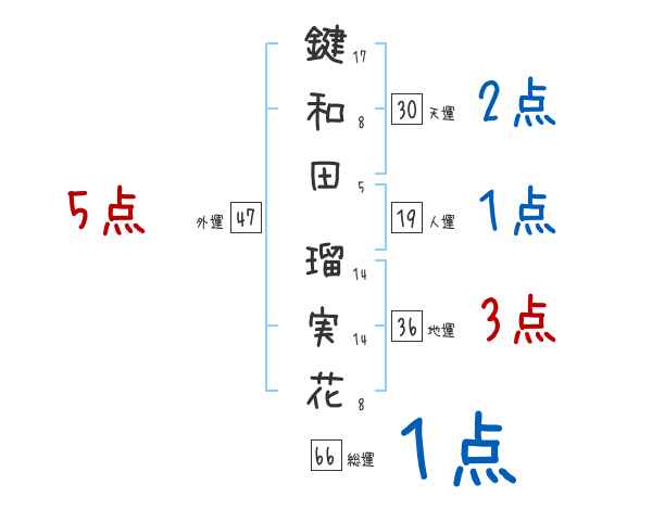 天運![]() | 鍵和田瑠実花さんの天運は30画の2つ星!浮き沈みの激しさに注意しましょう。 家系が持つ宿命的な運勢を表します。祖先から受け継いだ苗字ですので自分の力が及びません。家柄を象徴します。 |