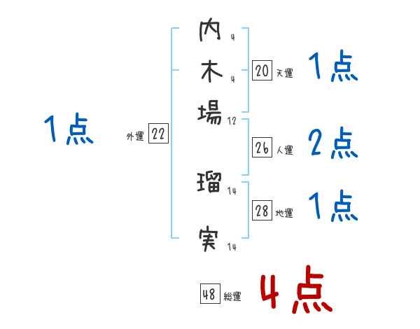 外運![]() | 内木場瑠実さんの外運は22画の1つ星!努力することが苦手ないっぽう手先が器用。芸術性にも優れる。 生活面を象徴する運勢です。外部から受ける影響力を表し、結婚運、家庭運や職場、環境への順応性を表します。 |