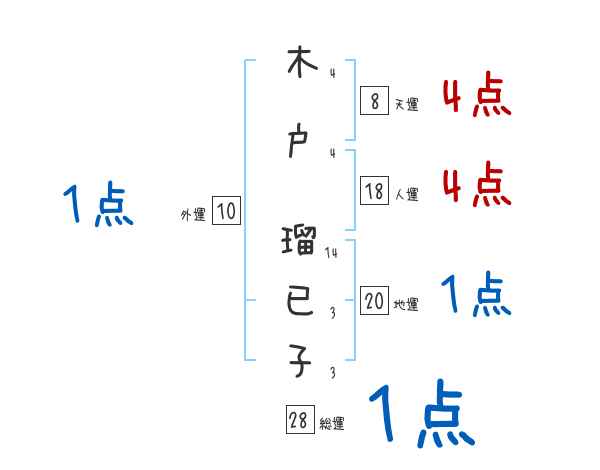 人運![]() | 木戸瑠已子さんの人運は18画の4つ星!情熱的で剛気。忍耐力があり信頼される。 性格や才能などを表す2番目に重要な運勢です。人間関係や協調性、社会的な成功に影響します。主に20歳から50歳ぐらいまでの中年期の運勢を表します。 |