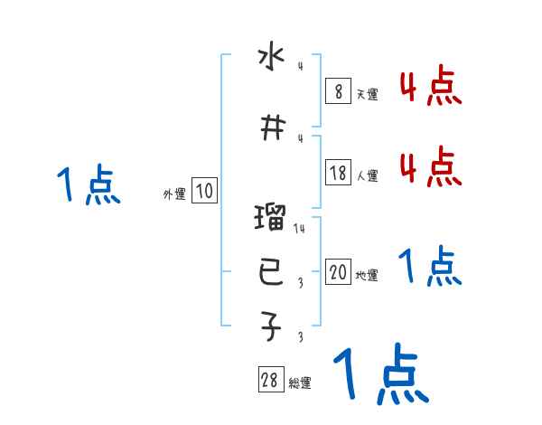 総運![]() | 水井瑠已子さんの総運は28画の1つ星!家庭環境に注意。スポーツで活躍できる能力があるかも。 あなたの人生を表す1番重要な運勢です。生涯を通じて影響する総合運となり、主に50歳以降の晩年期に影響を及ぼします。 |