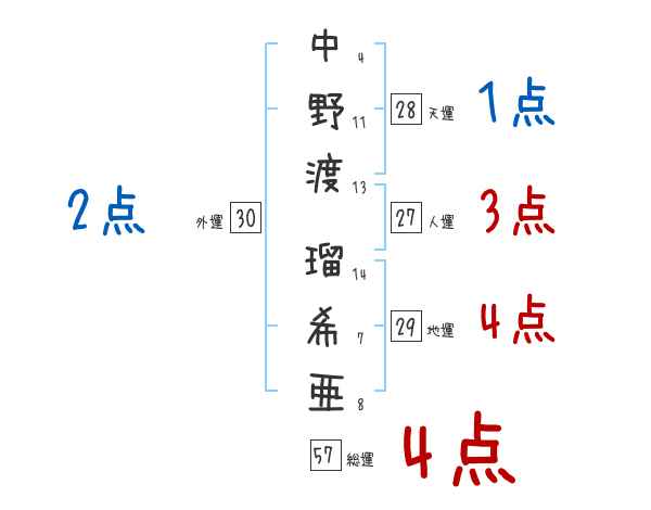 外運![]() | 中野渡瑠希亜さんの外運は30画の2つ星!浮き沈みの激しさに注意しましょう。 生活面を象徴する運勢です。外部から受ける影響力を表し、結婚運、家庭運や職場、環境への順応性を表します。 |